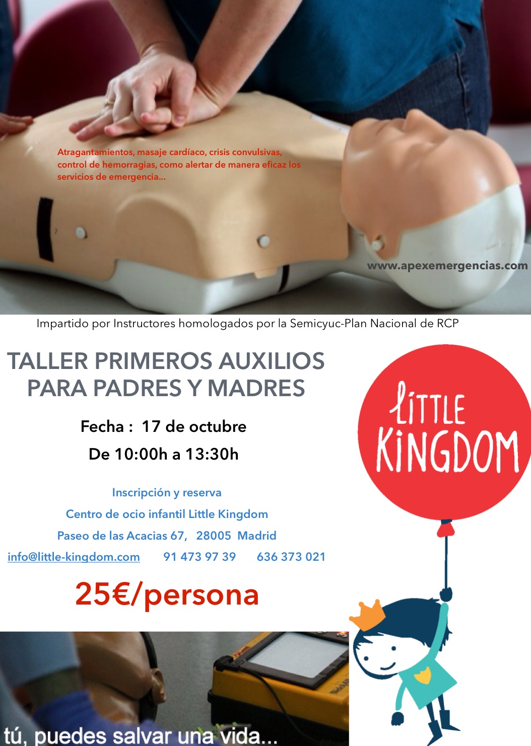 Descripción: Impartido por un instructor de Apex Emergencias S.L., acreditado por el Plan Nacional de RCP. Las materias a tratar son, entre otras, como actuar ante un atragantamiento, una parada cardiorrespiratoria, hemorragias o convulsiones, como activar correctamente a los servicios de emergencia, etc., realizando prácticas con maniquíes sobre masaje cardíaco.
